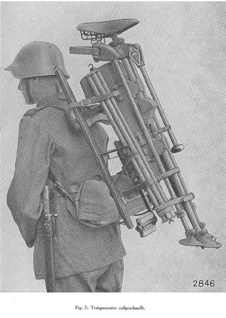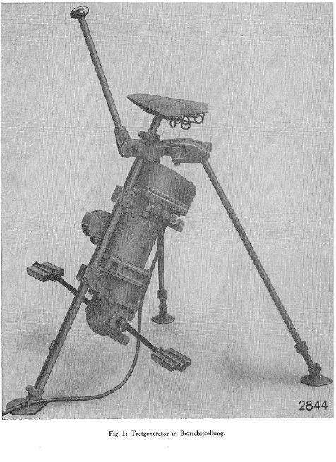 Durch langsames Treten, 58 bis 62 Umdrehungen pro Minute, wird die für den Betrieb benötigte Leistung erzeugt. Die abgegebene Spannung wird dauernd am Instrument überwacht. Der Sollwert der Spannung ist erreicht, wenn der Zeiger in der Mitte des weissen, leuchtenden Striches steht.