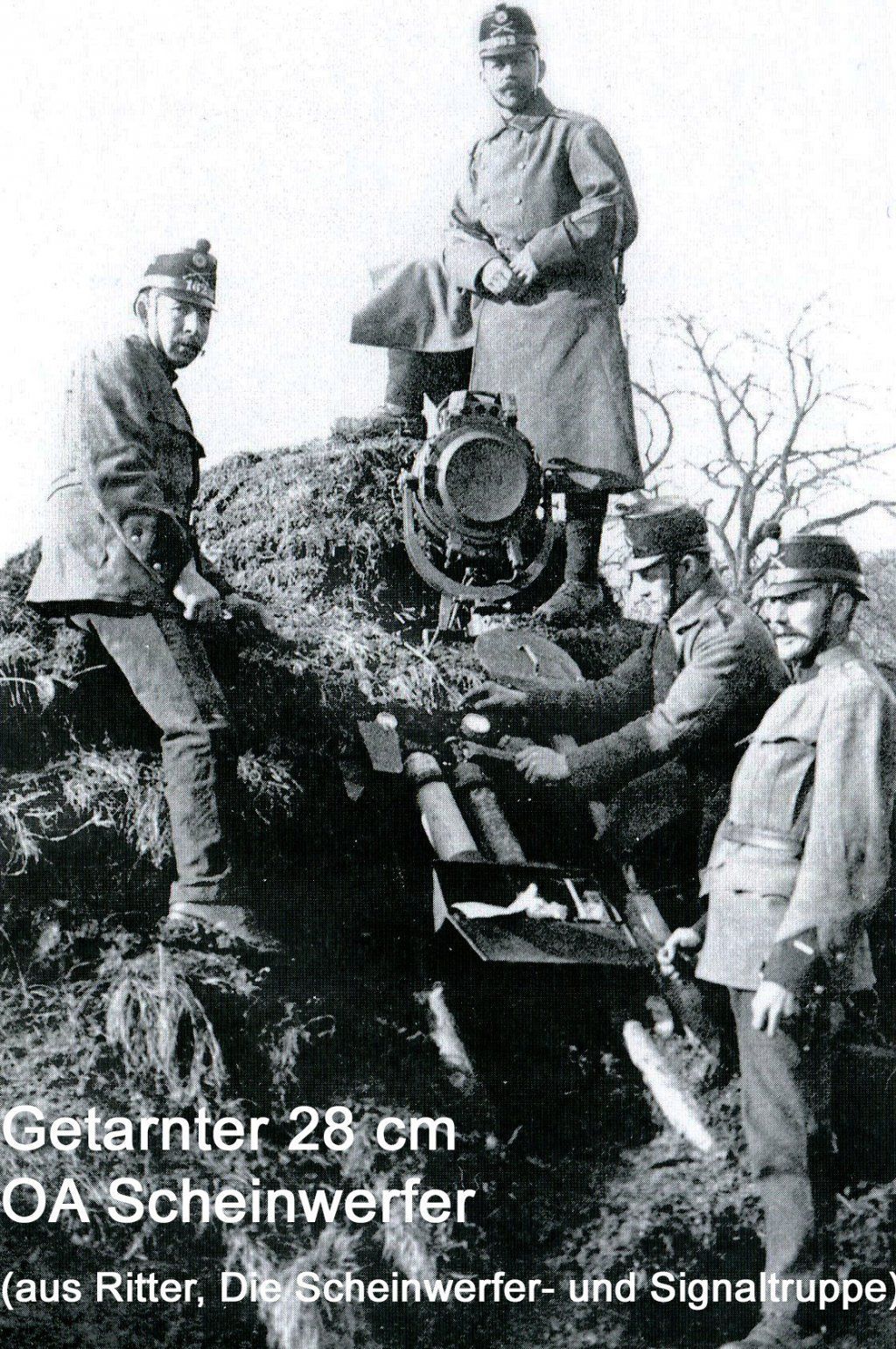 Dieser Scheinwerfer wurde während des 1. Weltkrieges als Gefechtsfeldbeleuchter beschafft. Der Hersteller war die Firma Sprecher + Schuh, Aarau. Dieser Scheinwerfer wurde auch von den Firmen Zeiss, BAMAG Berlin und Chance Brothers Birmingham hergestellt. Die Apparate benutzen die Sauerstoff-Azetylen Flamme als Lichtquelle. Mit einem raffinierten System wurde sehr grelles Weisslicht erzeugt: Die Stichflamme erhitzte ein Kalkplättchen von 1 cm Durchmesser auf Weissglut. Dieses Plättchen strahlte hochintensives Weisslicht ab, gebündelt vom Parabolspiegel.