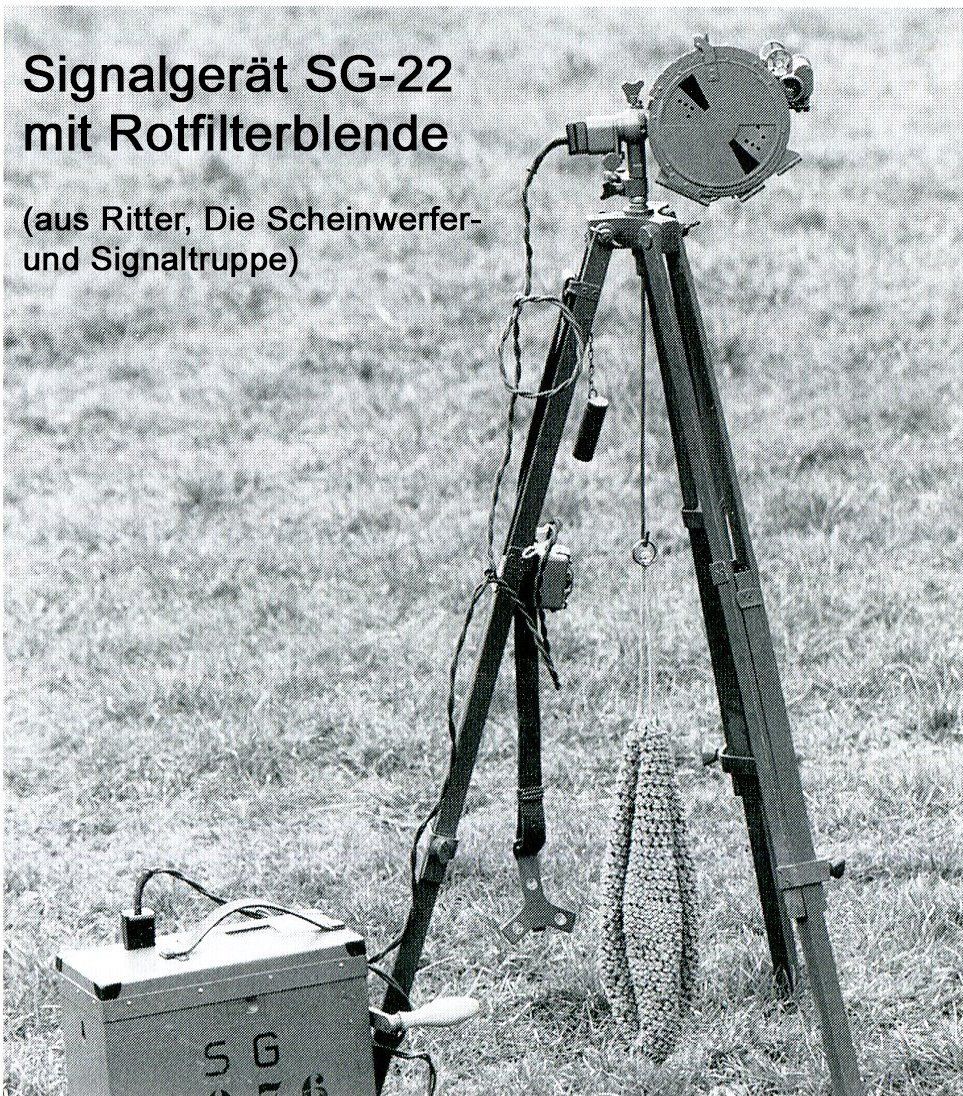 Das SG 22 wurde in sehr grosser Zahl beschafft (2300 Stück). Das verwundert nicht. Denn das Gerät war so etwas wie ein «Quantensprung» im Bereich der Signalgeräte: Carl Zeiss in Jena benutzte nicht nur besonders verlustarme Optik, sondern berücksichtigte auch die praktischen Erkenntnisse aus dem eben zu Ende gegangenen Ersten Weltkrieg. Ende der Zwanzigerjahre kam die sog. «Rotfilterblende» hinzu, um bei kurzen Verbindungsdistanzen den ausgestrahlten Lichtstrom zu vermindern. Wohl ein früher Vorläufer der späteren «elektronischen Schutzmassnahmen» ...